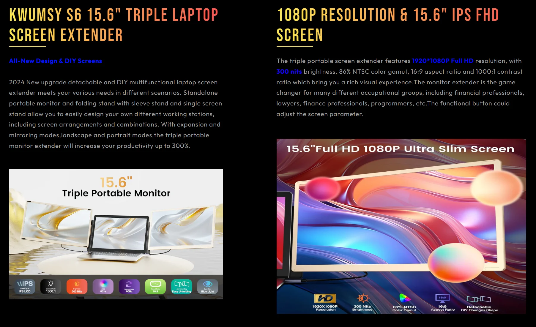 15.6"Removable Screen Laptop Screen Extender FHD 1080P IPS Triple Monitor Fit for Laptops with 360°Rotation with Stand Plug&Play - S6
