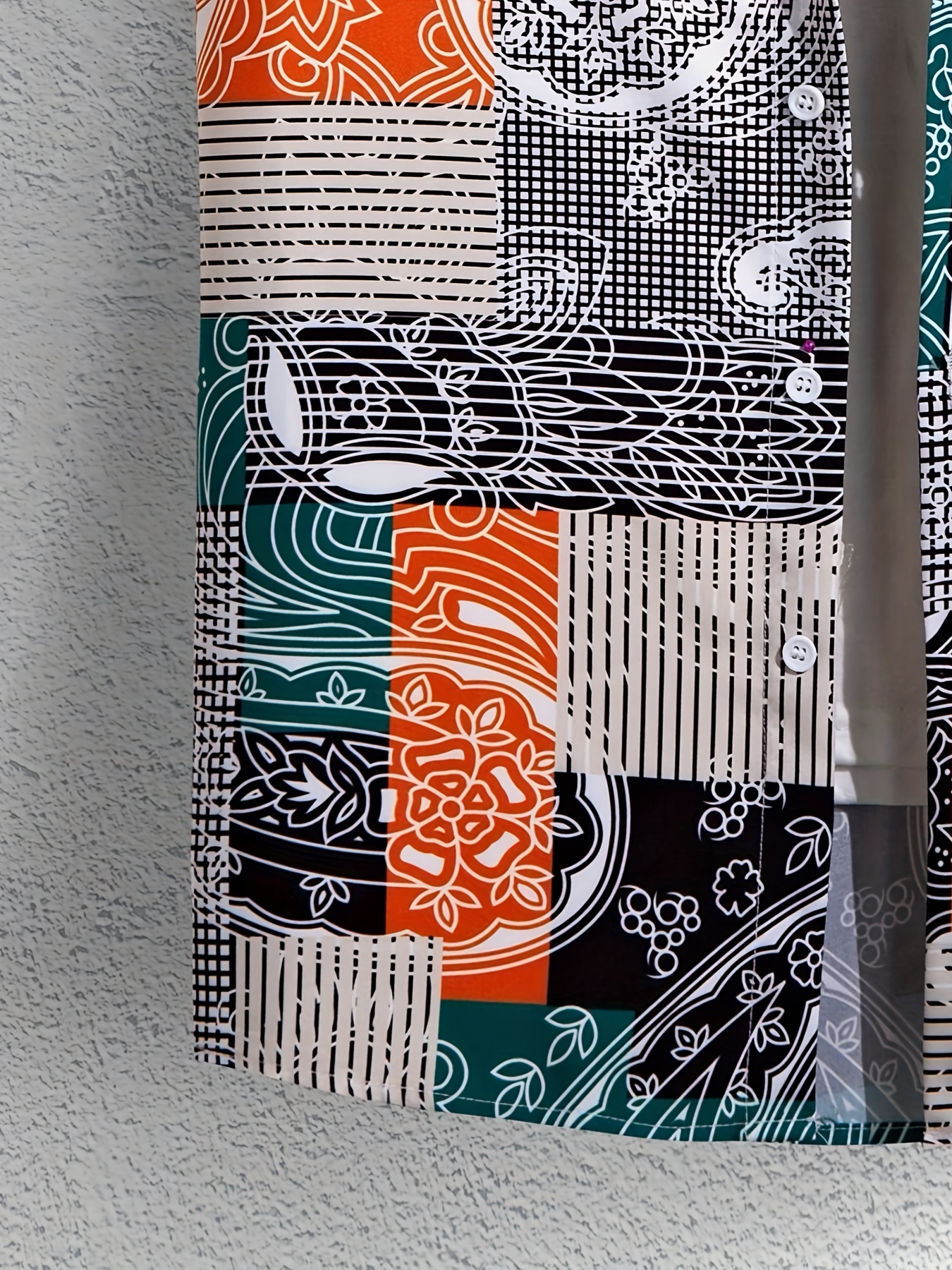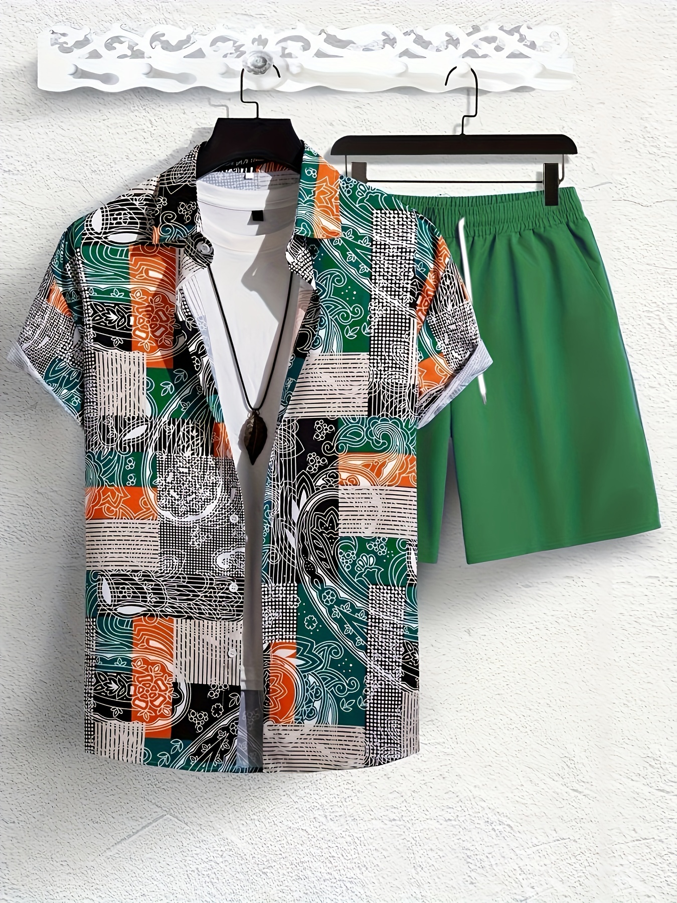 Plus Size Mens Summer Outfit - Stylish 2-Piece Ensemble with Unique Patchwork Print Graphic Short-Sleeve Shirt and Matching Shorts - Perfect for Hot Summer Days - Mixed Color / 0XL(44)