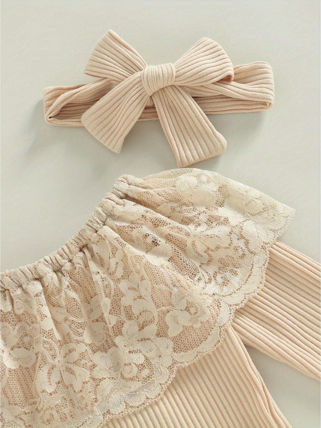 Infant Baby Girl Clothes Lace Ruffle Long Sleeve Off Shoulder Ribbed Romper Top Denim Flare Pants Headband Jeans Bell Bottoms Set Cute Fall Outfits - Apricot / 3-6M