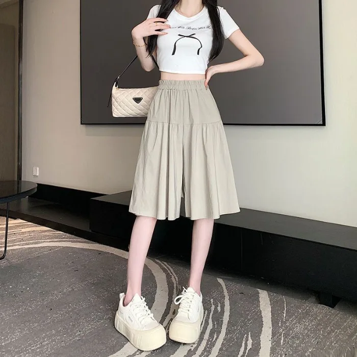 Ladies' A-line skirts, high-waisted, loose and puffy, casual ice silk, wide-leg capre pants, comfortable and convenient women - Beige / L