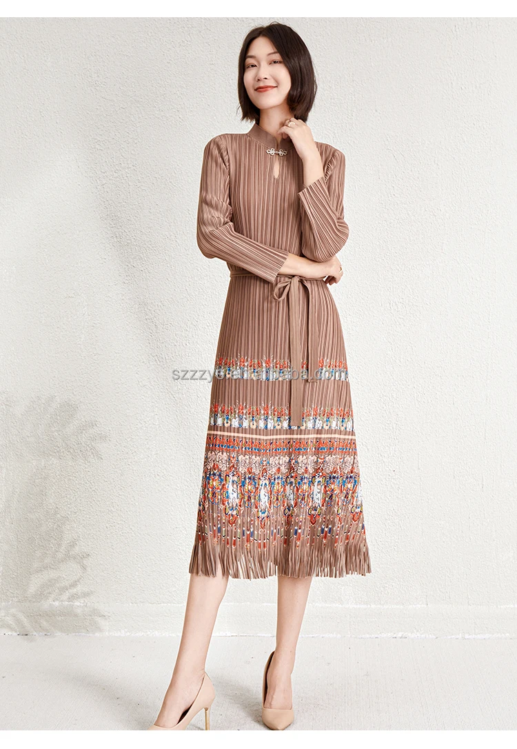 Ladies Dresses 2025 Elegant Casual Dresses Miyake Pleated Dresses - Khaki / One Size