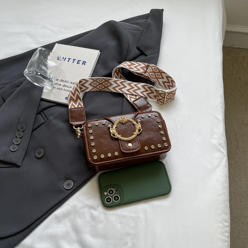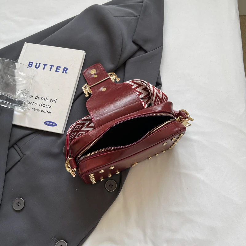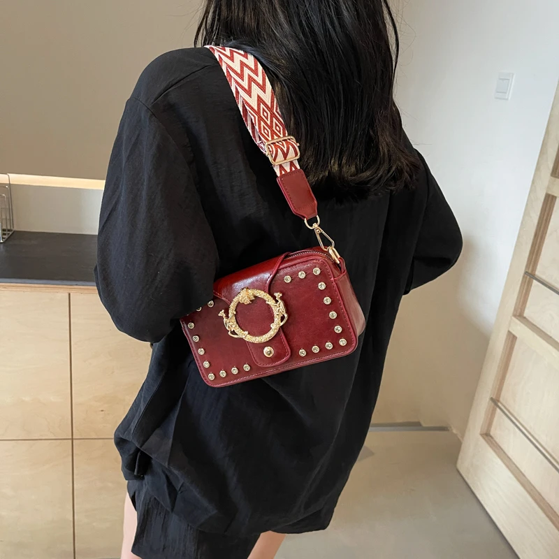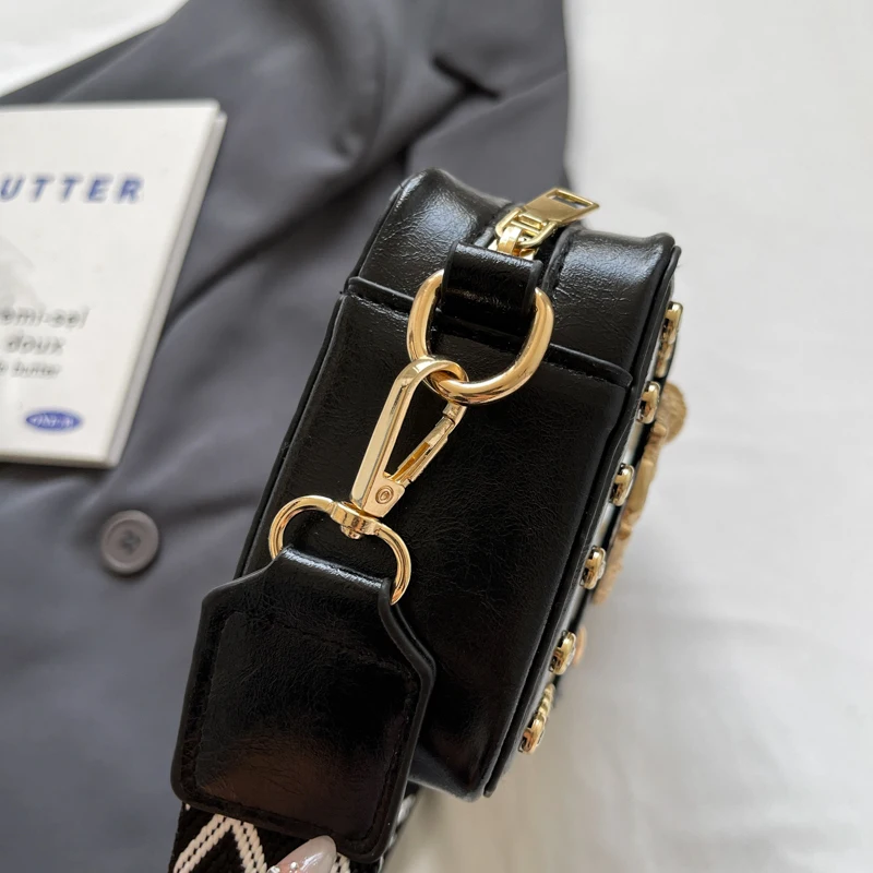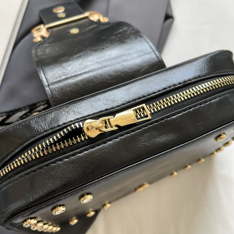 Luxury Rivet Pu Leather Crossbody Bag For Women 2024 New Wide Strap Shoulder Handbag And Purse Black Zipper Messenger Bags