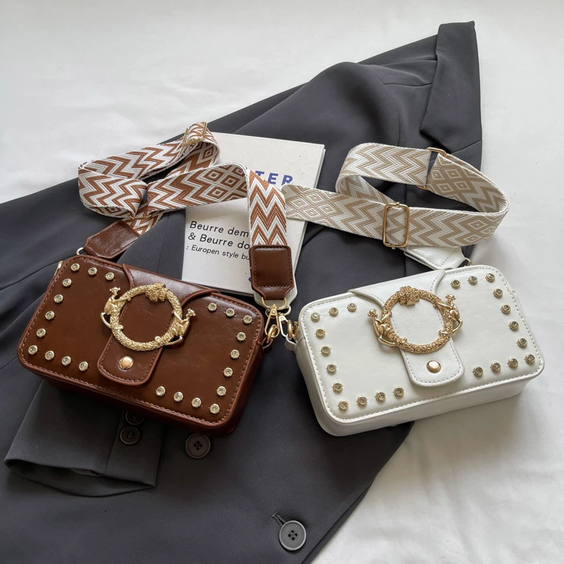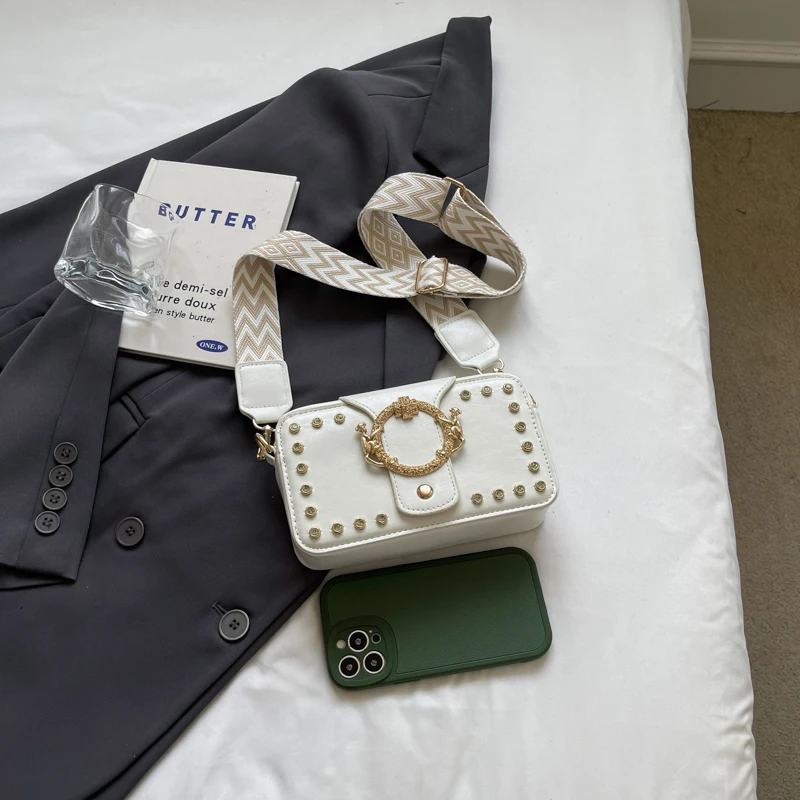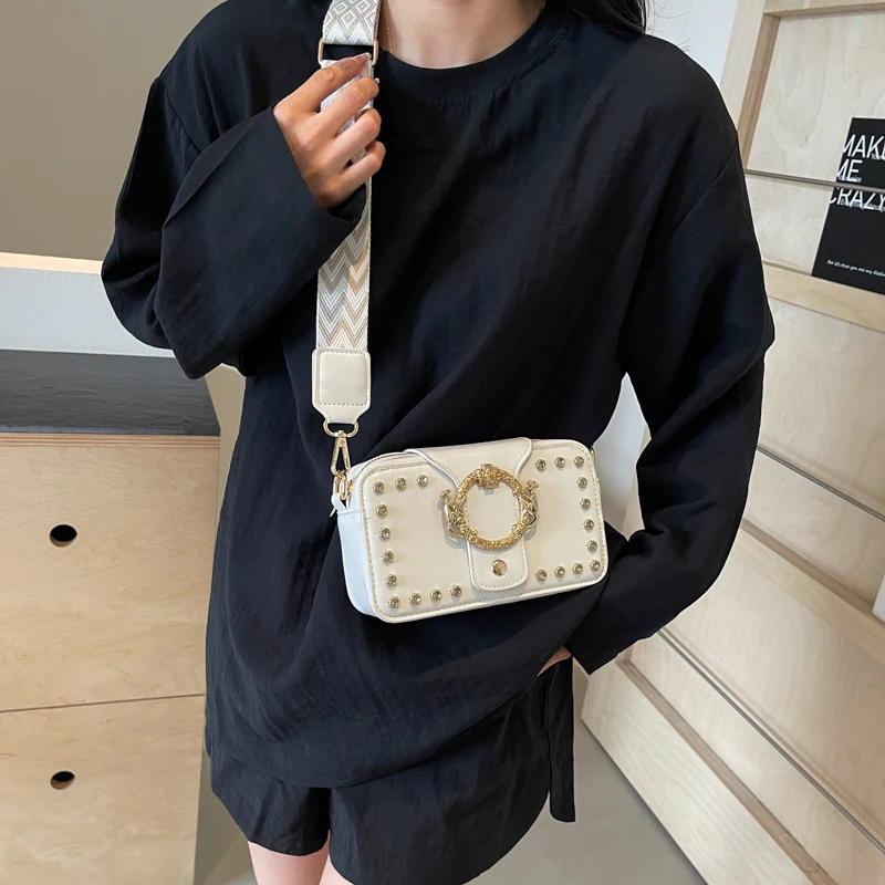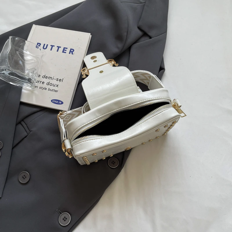Luxury Rivet Pu Leather Crossbody Bag For Women 2024 New Wide Strap Shoulder Handbag And Purse Black Zipper Messenger Bags - white / (20cm