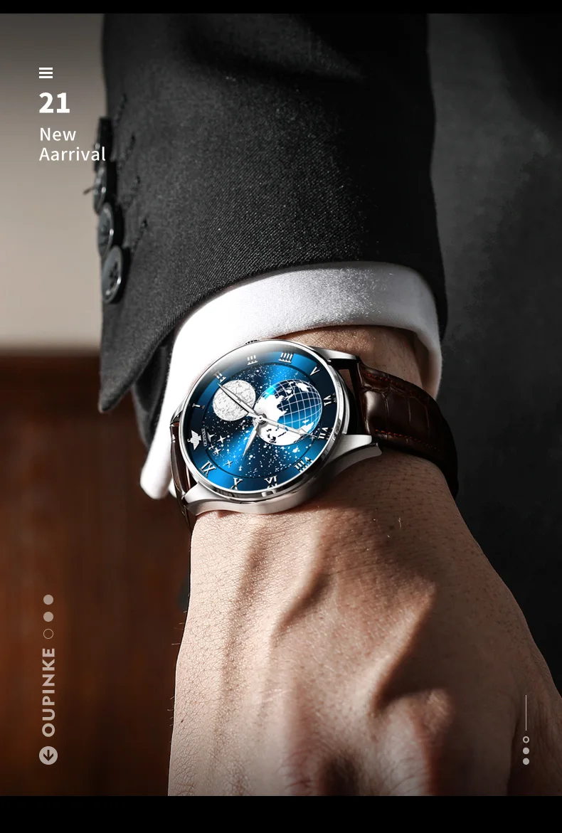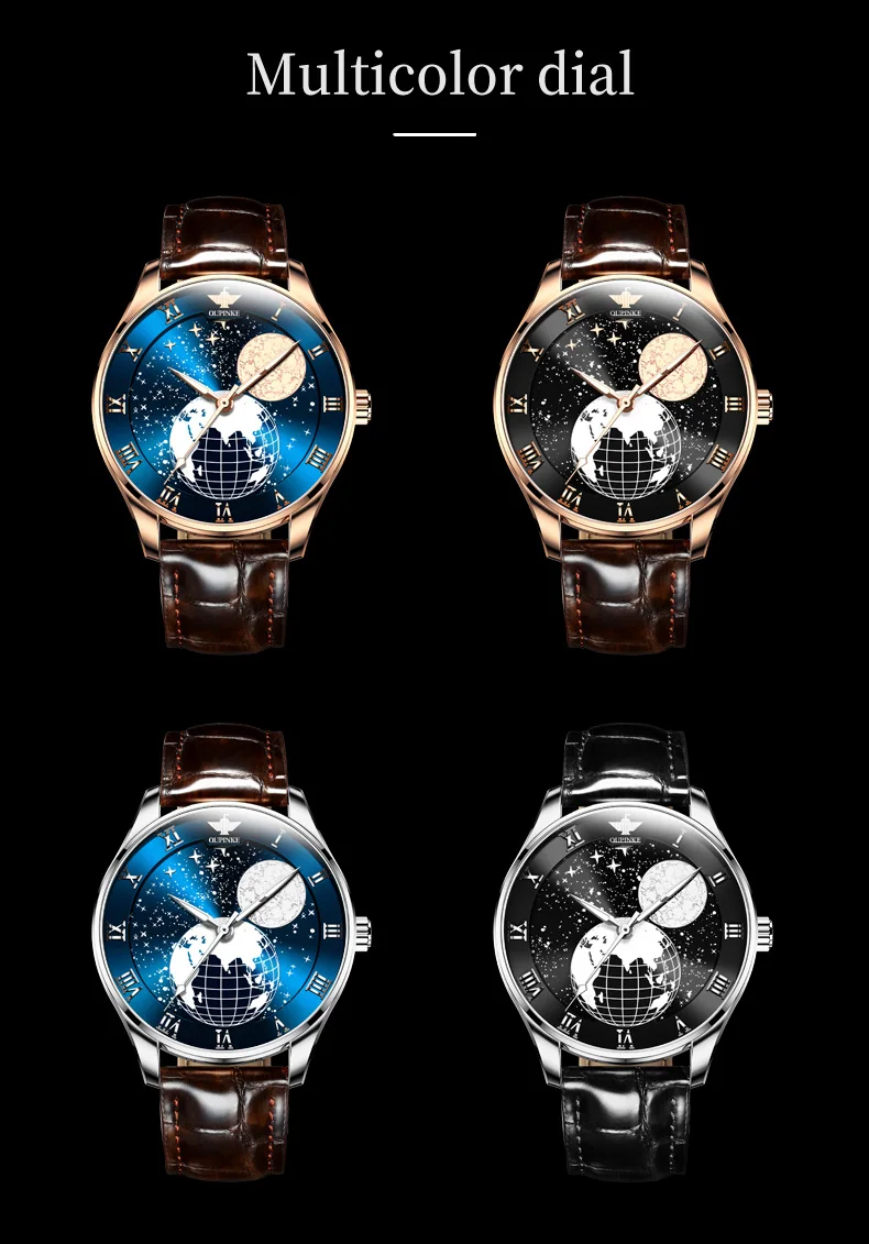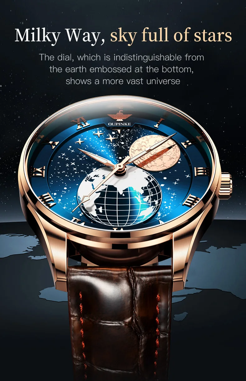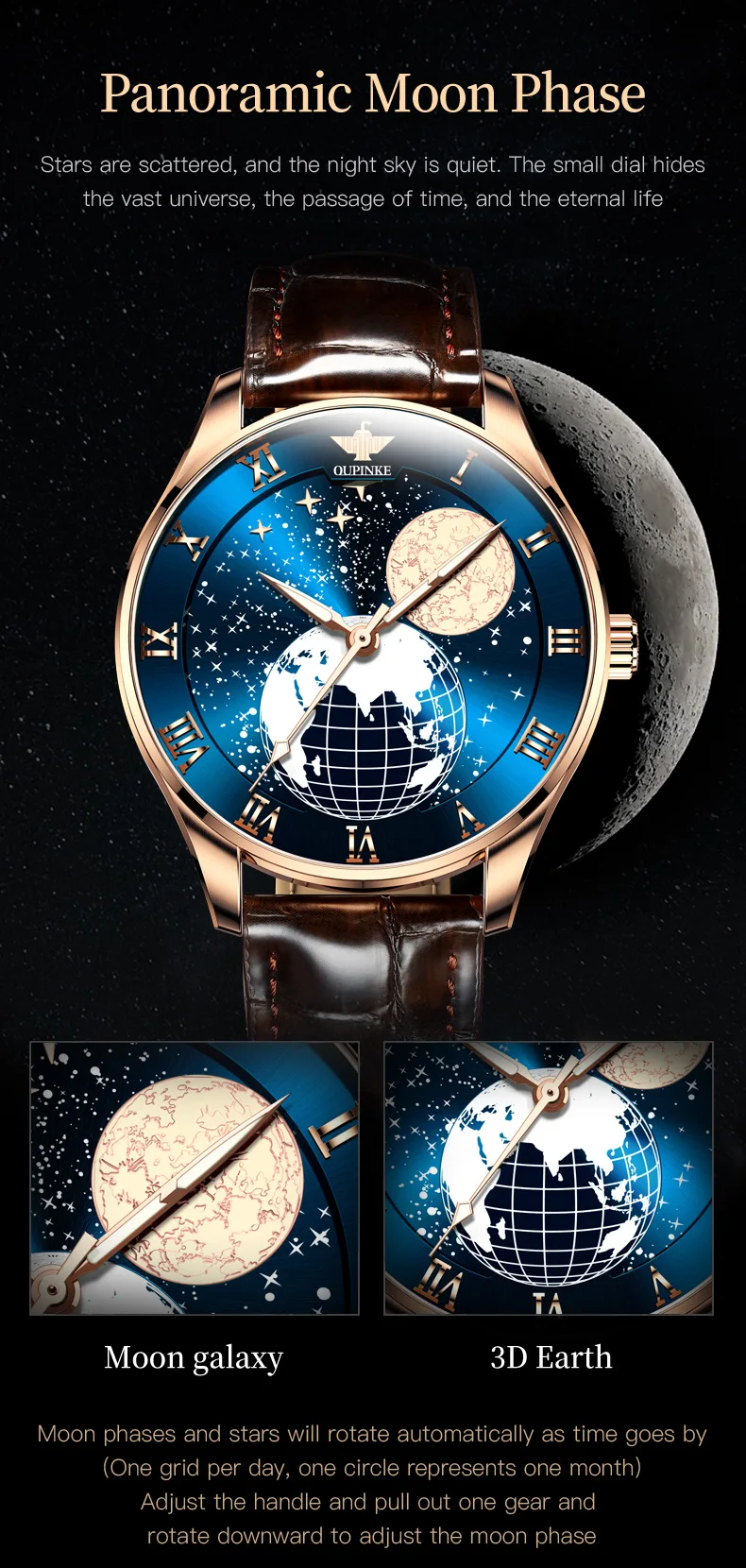 Oupinke 3177 OEM Starry Sky Moon Phase Sapphire Crystal Glass Automatic Leather Business Male Mechanical Mens Wrist Watch - Black / Mechanical watch