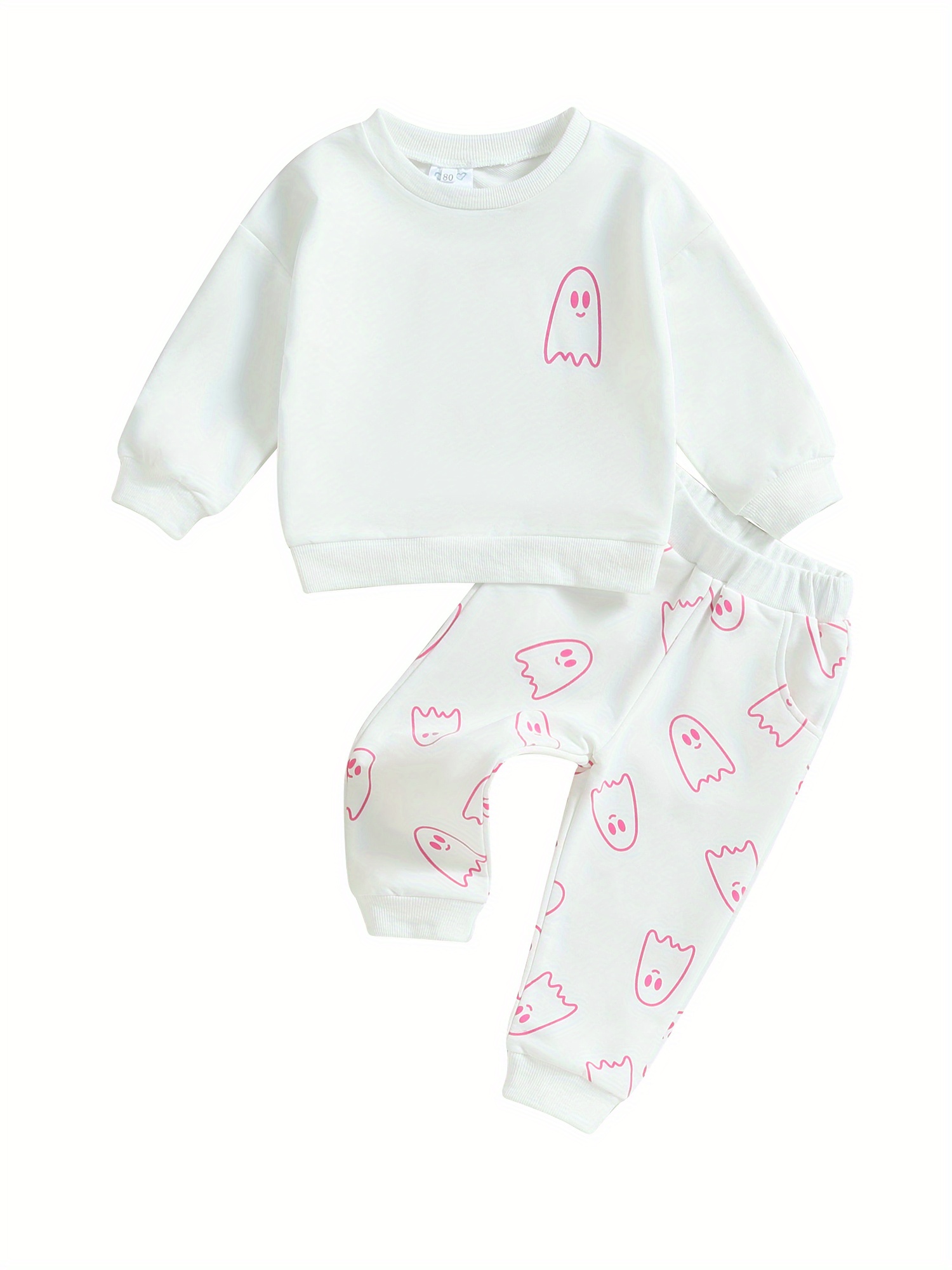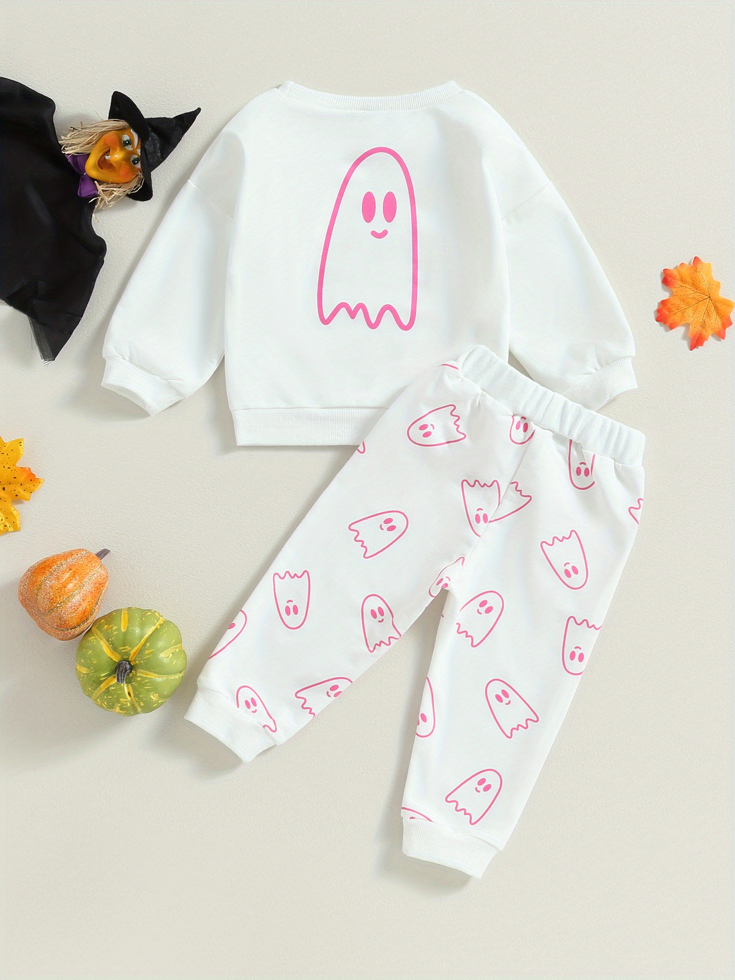 Toddler Girls Boys Fall Outfits Ghost Print Crew Neck Long Sleeve Sweatshirts and Long Pants 2Pcs Halloween Clothes Set - Rose Red / 9-12M