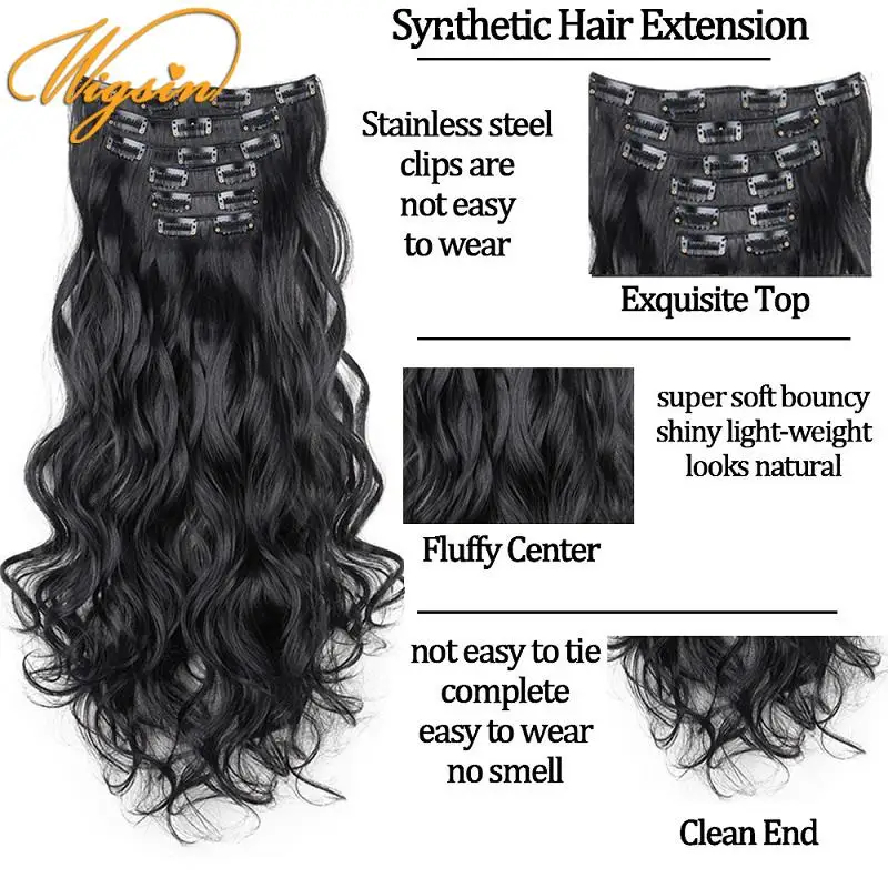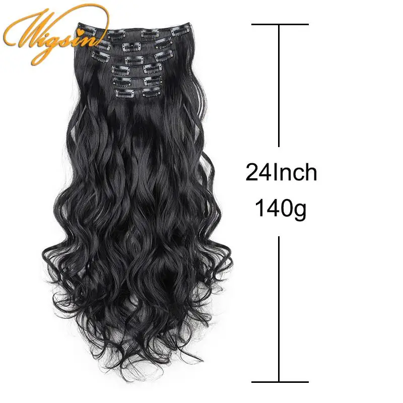 WIGSIN Synthetic 24Inch Long Curly 16 Clips Hair Extension Heat Resistant Fiber Black Brown Hairpiece for Women