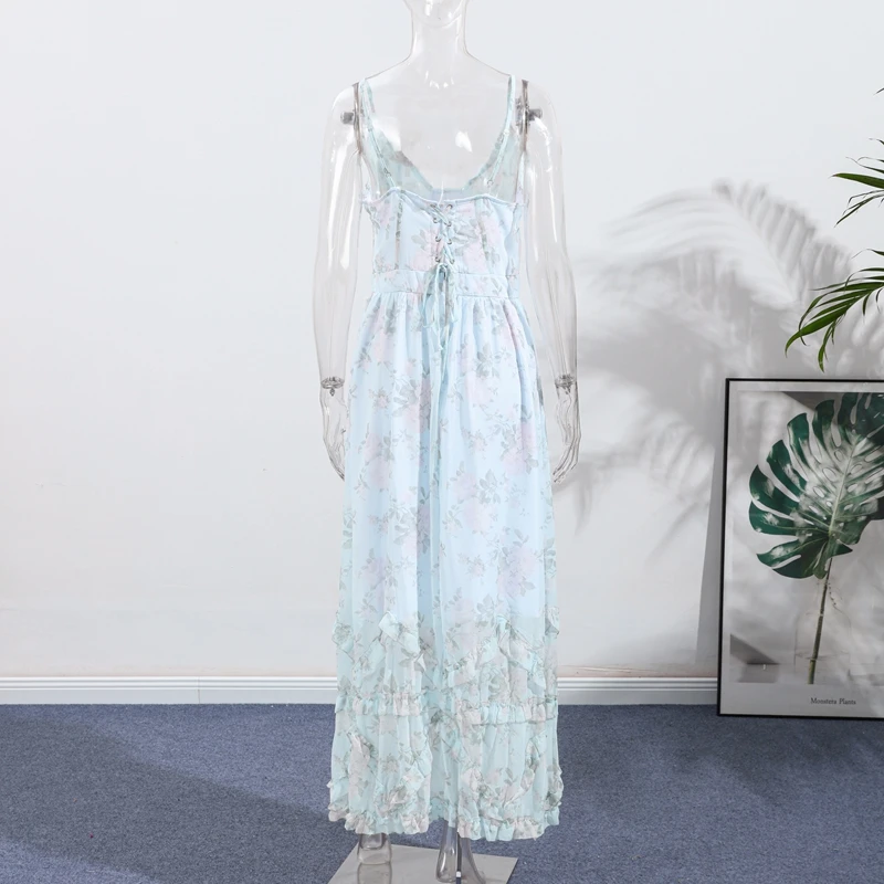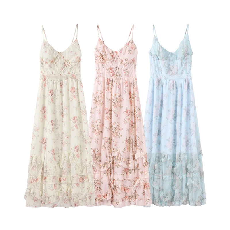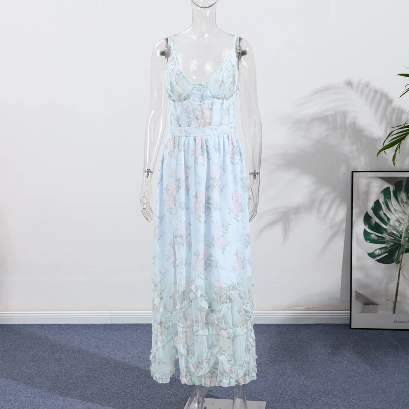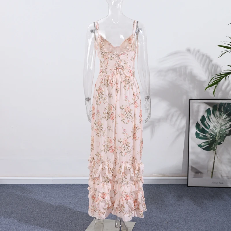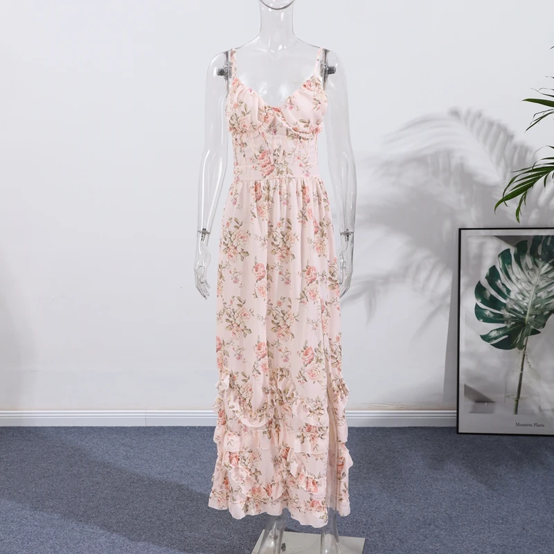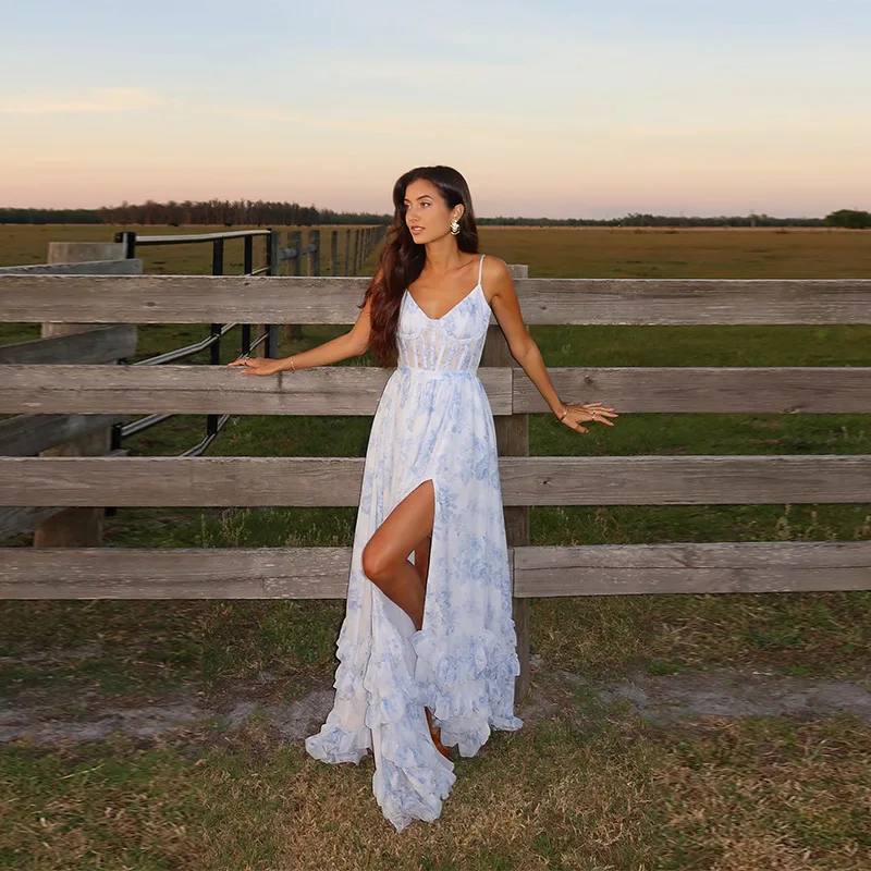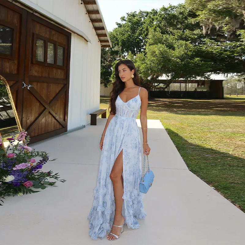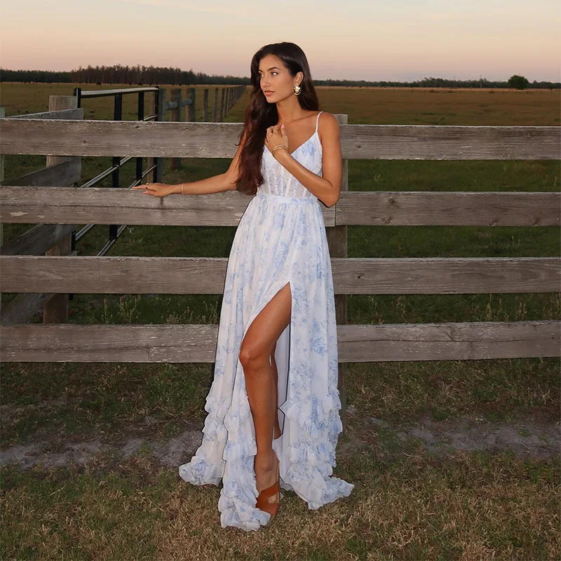 Elegant Off Shoulder Floral Print Prom Dress Ruffle Side High Split Lace Vestidos Princess Shiny Floor-length Evening Dresses - pink / XL
