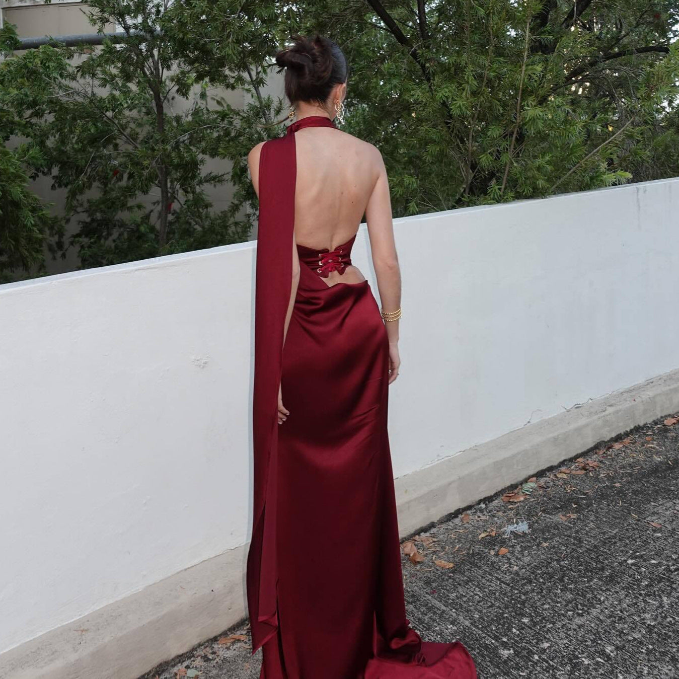 Halter-Neck High-End Satin Dress With A Light Luxury And Elegant Style - Burgundy / S