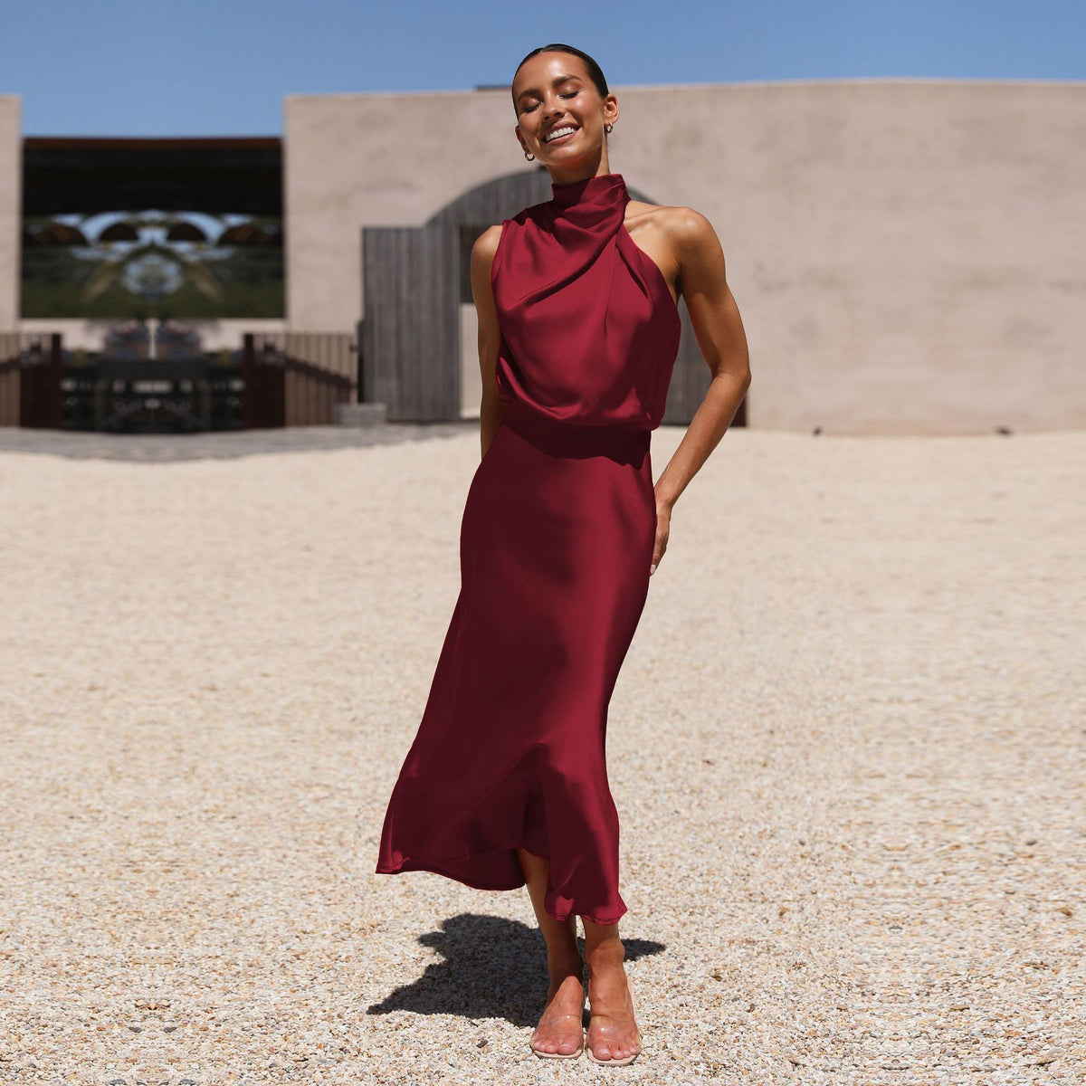 High-Necked Satin Evening Dress For Socialites - Gqqt007 Apricot / S