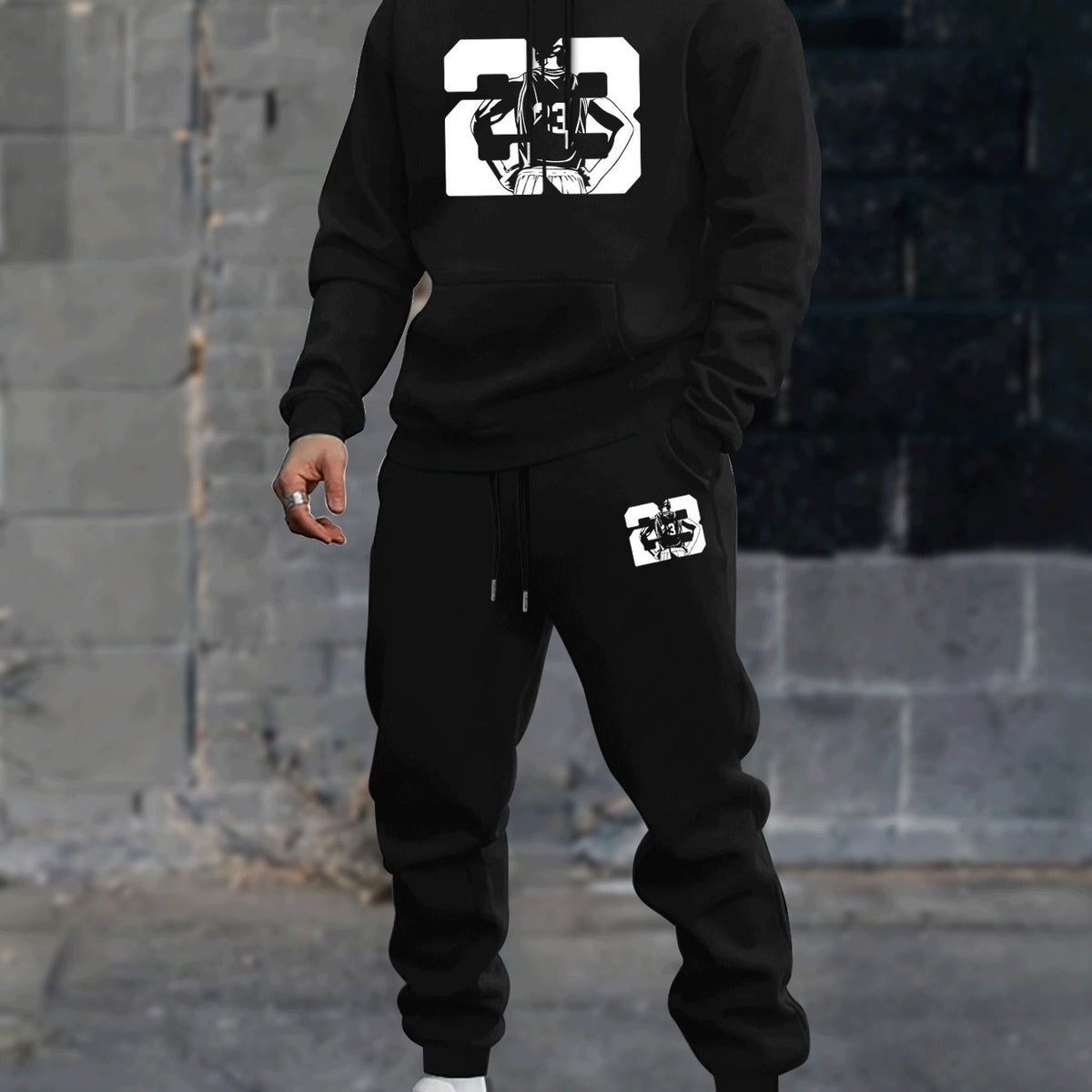 2pcs Men's Co-ord Set - Long Sleeves Hoodie & Sweatpants, Casual Comfy Style, Spring Autumn Winter Outfits Clothing with Silhouette Design No.23 - Black / S
