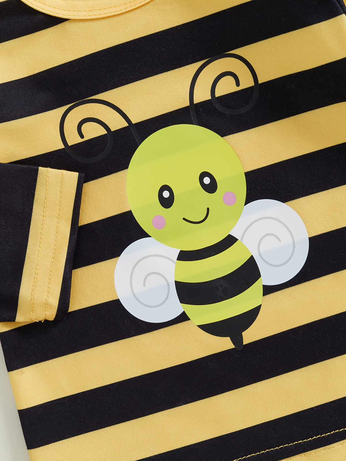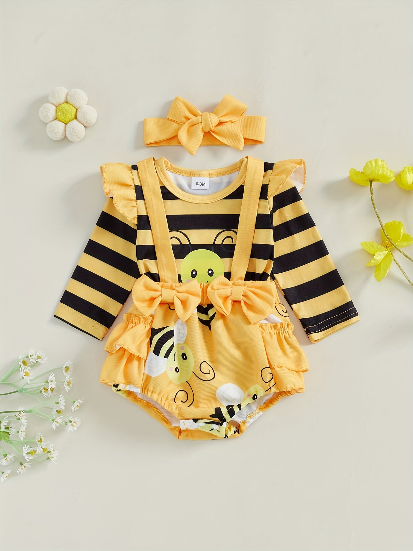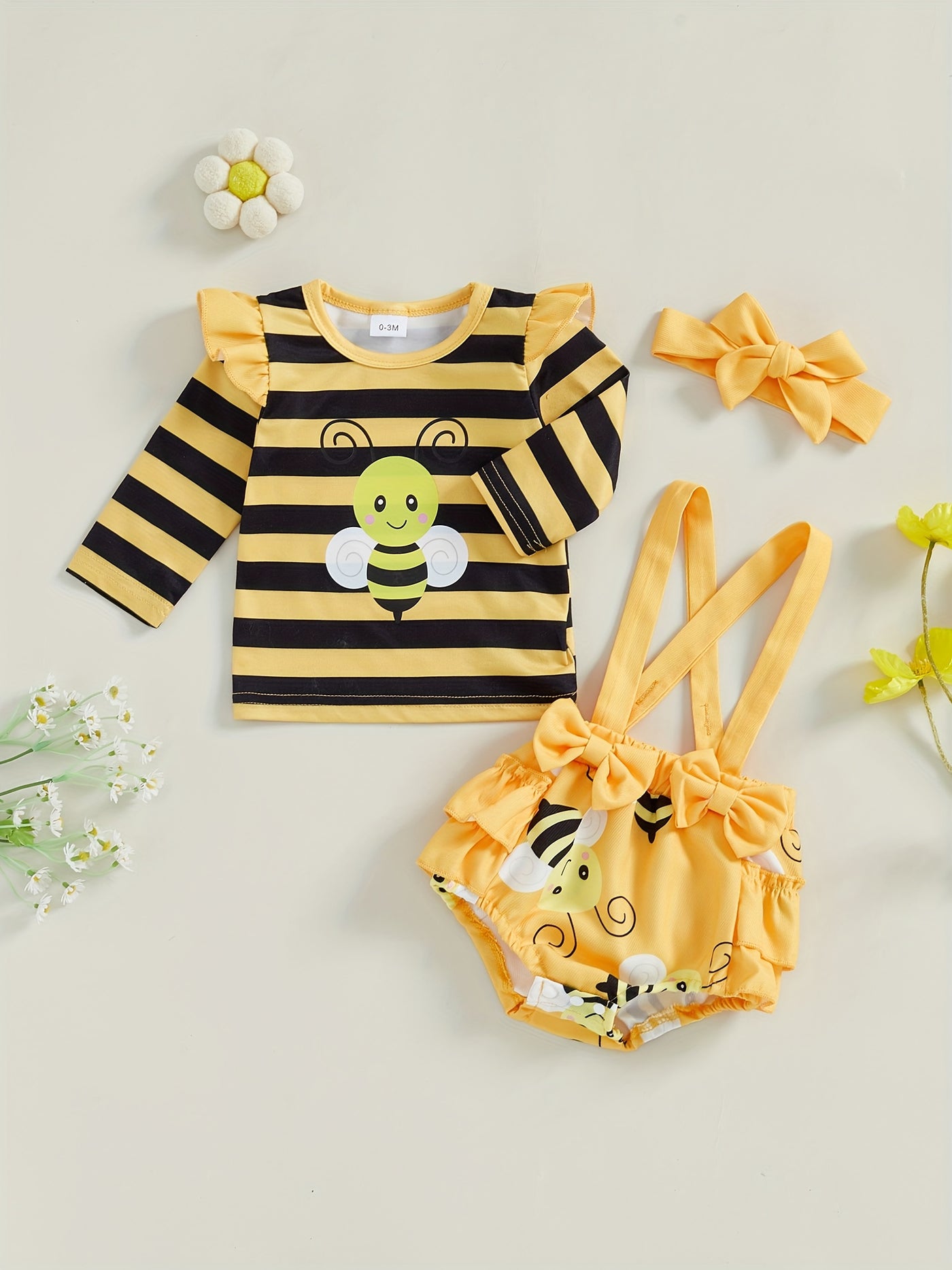 Baby Girl Fall Outfits Stripe Bee Print Long Sleeve Romper Suspender Shorts Headband 3Pcs Clothes Set 0 3 6 12 18 Months - Yellow / 0-3M