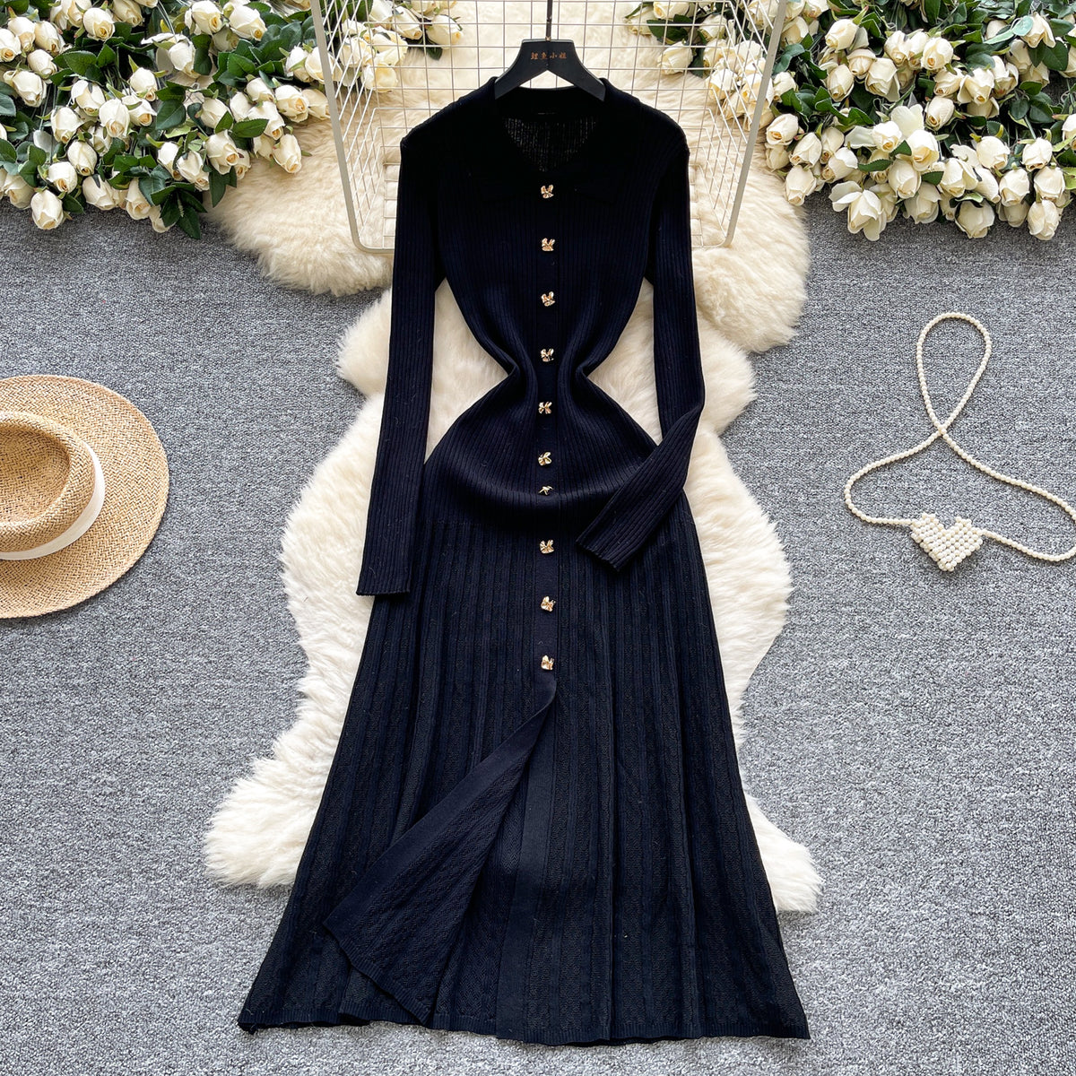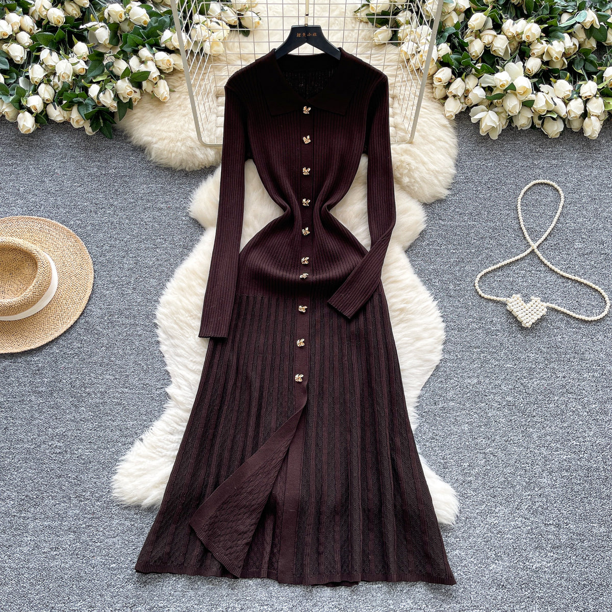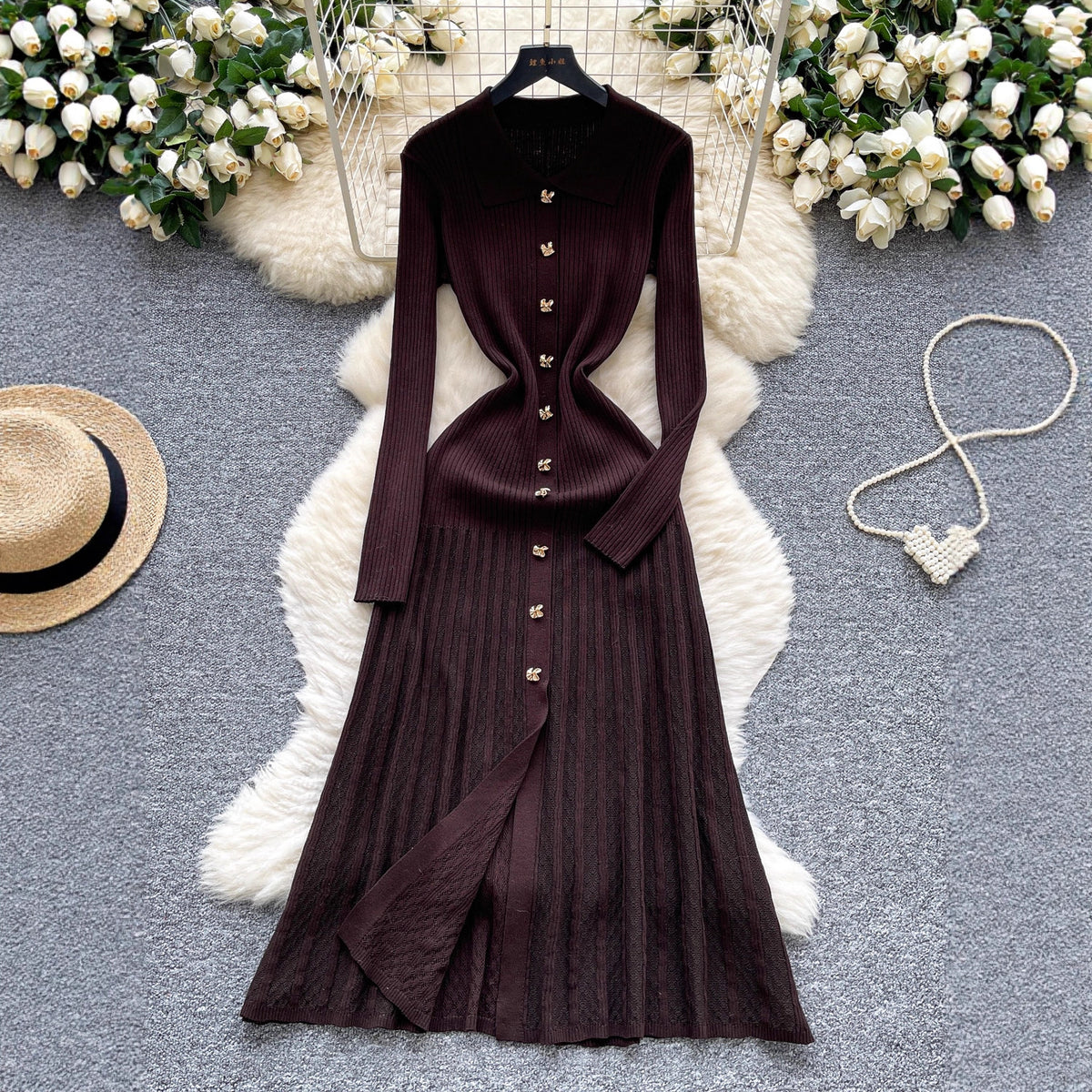 Elegant Polo Collar Long-Sleeved Metal Buckle Waist-Cinching Crochet Knitted Dress - Uniform code / Rose red