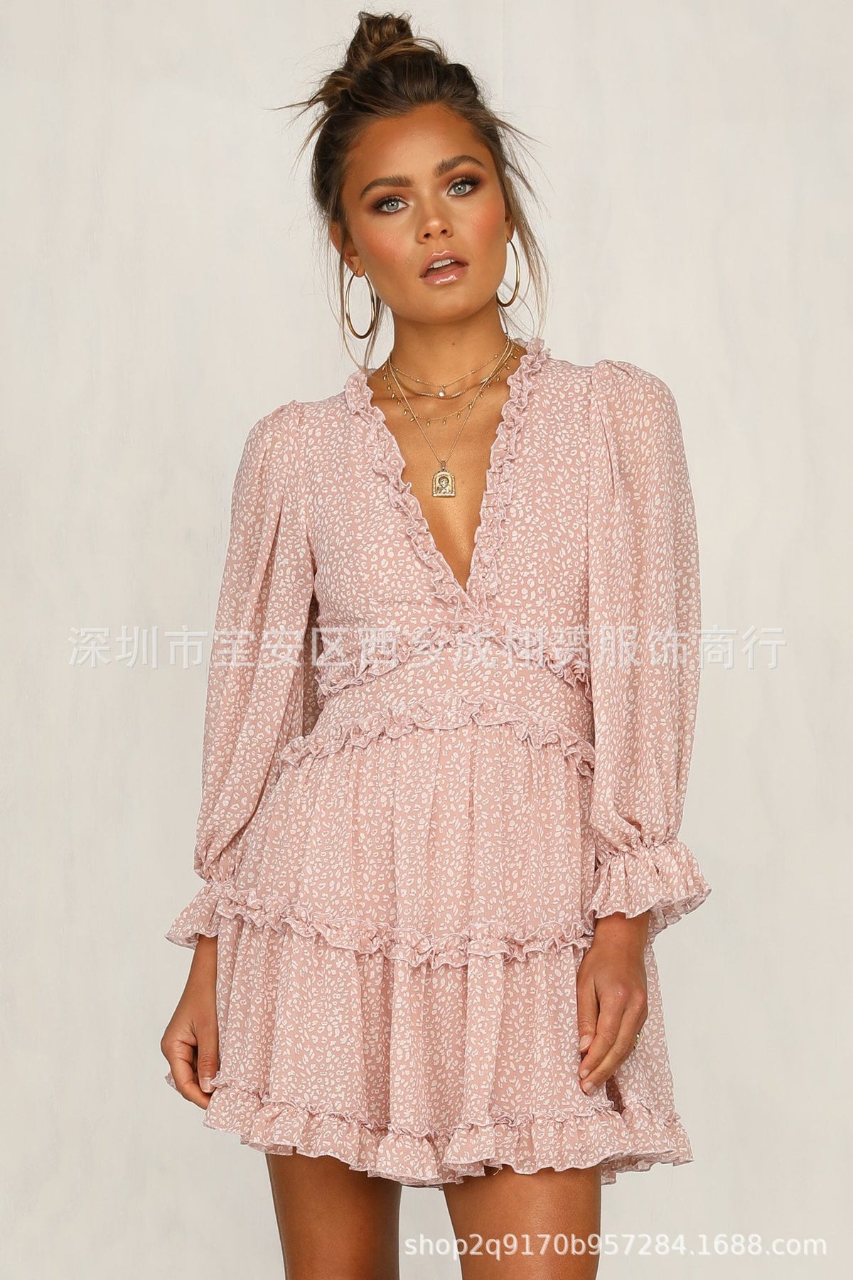 European And American Spring And Autumn New V-neck Waist Bubble Sleeve Long Sleeve Chiffon Dress - A Large Number Of In Stock, A Large Quantity Of Cong / L