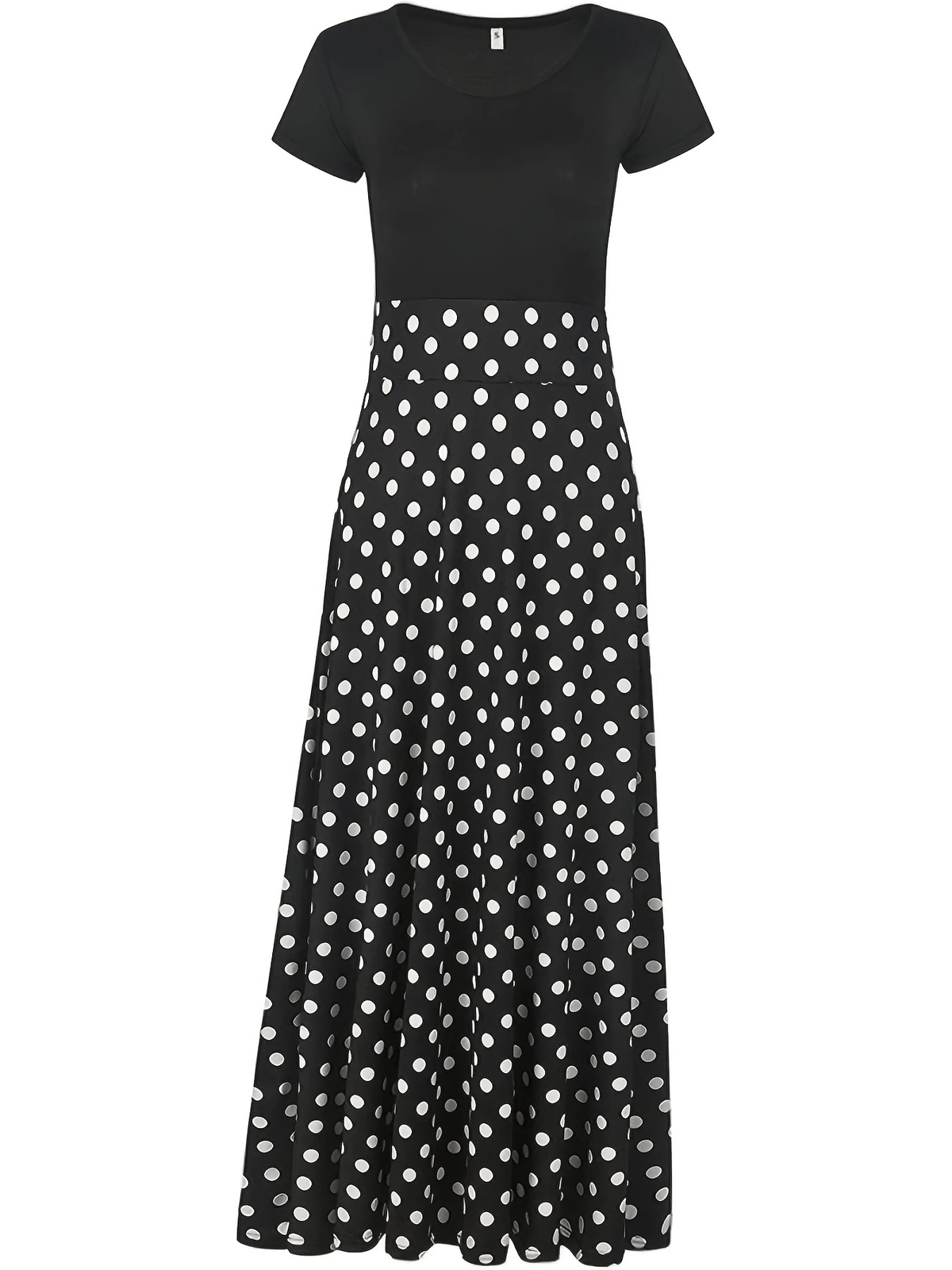 Floral Printed Crew Neck Pendulum Maxi Dress - Elegant Short Sleeve Slim Waist Pleated Design, Micro Elastic Polyester Knit Fabric, Random Printing for Womens All-Season Elegant Dressing - Black / S