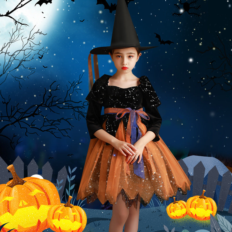 Halloween Children Masquerade Ball Witch Princess Dress - Hat + Clothes + Magic Wand + Send Light String / 110cm