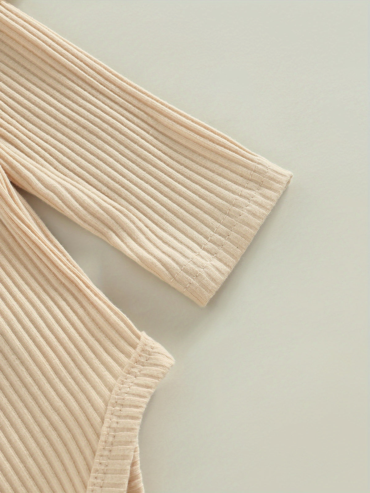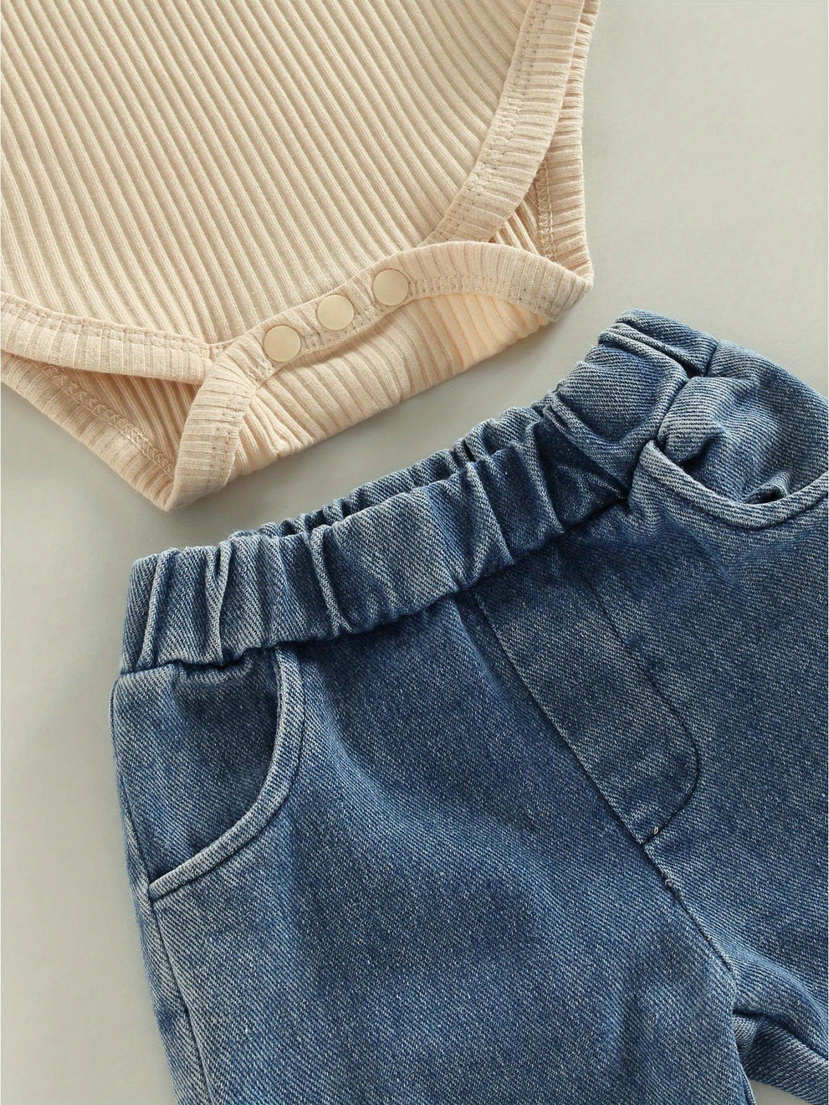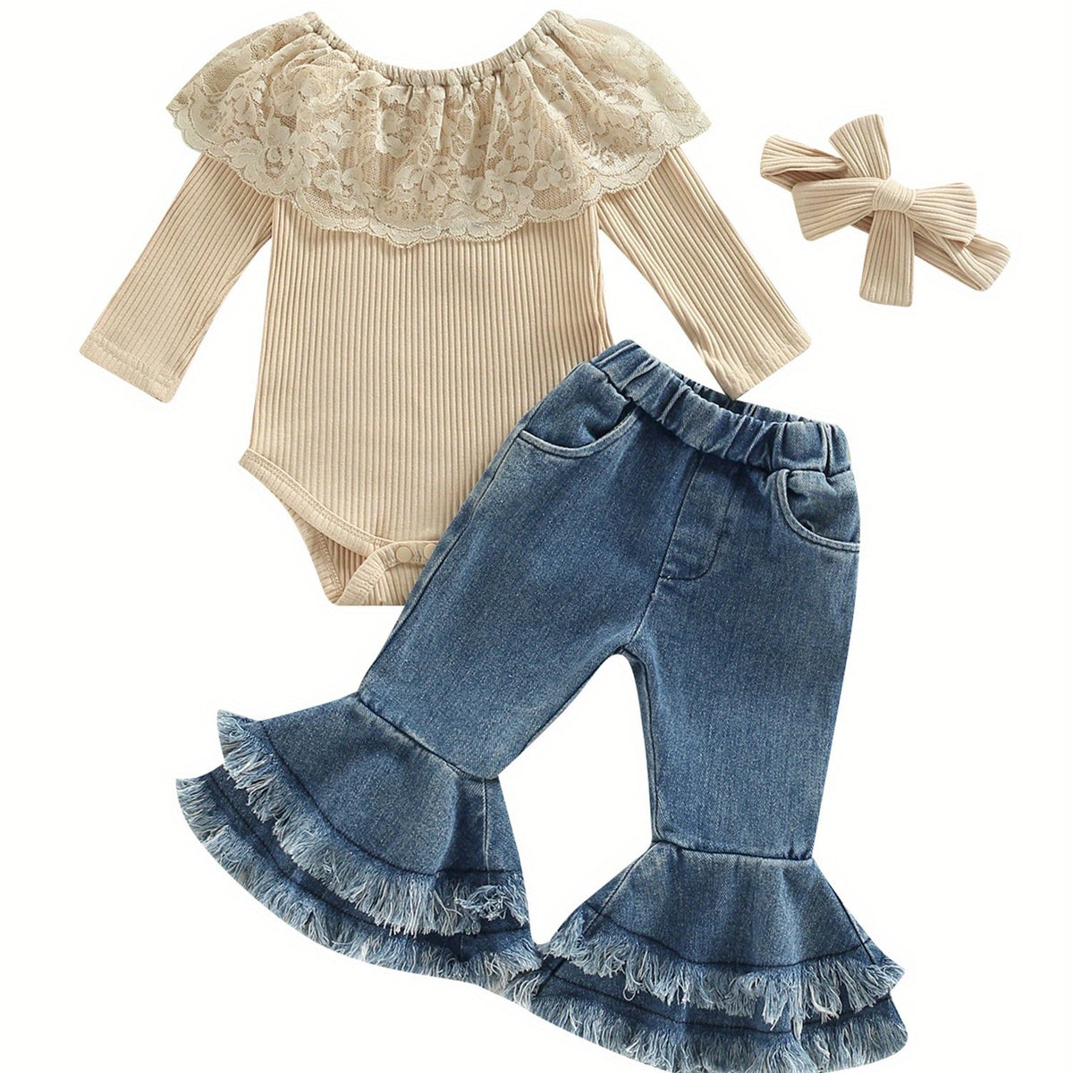 Infant Baby Girl Clothes Lace Ruffle Long Sleeve Off Shoulder Ribbed Romper Top Denim Flare Pants Headband Jeans Bell Bottoms Set Cute Fall Outfits - Apricot / 3-6M
