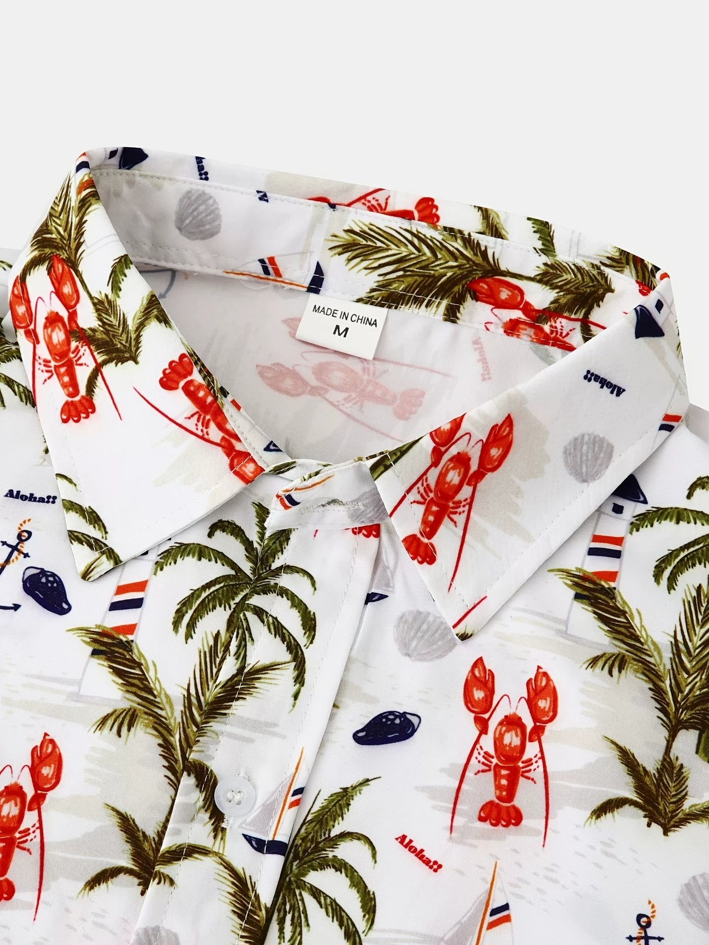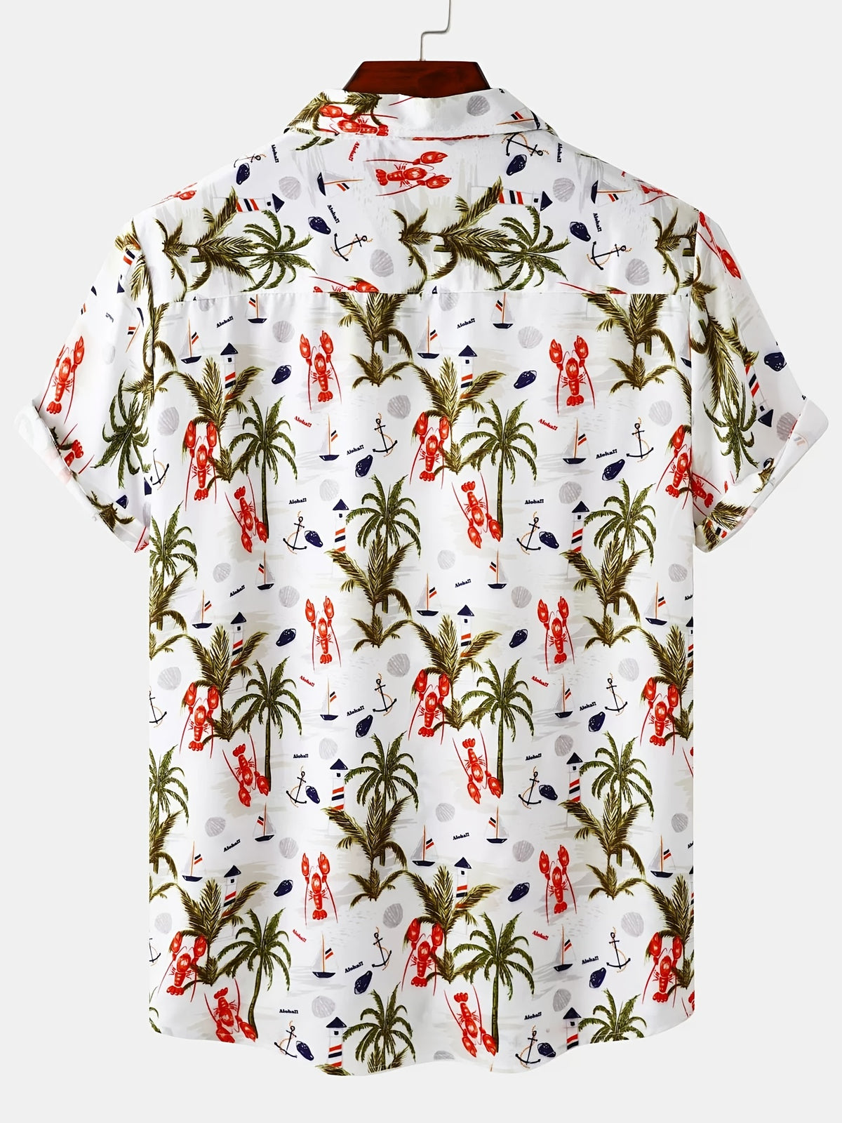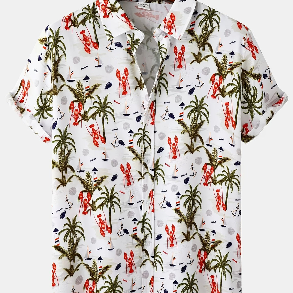 Mens Palm Tree & Lobster Paradise Short Sleeve Hawaiian Shirt - Lightweight, Comfortable, Perfect for Summer Beach Vacations - White / M(38)
