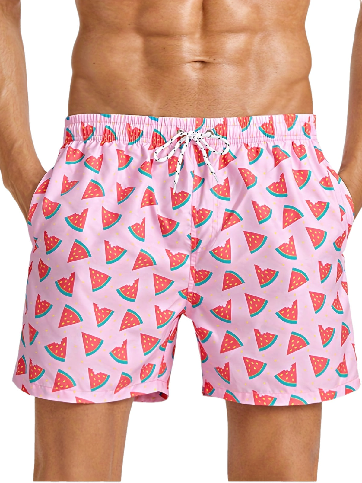 Mens Watermelon Print Hawaiian Shorts - Ultra-Comfortable Quick Dry Swim Trunks with Pockets & Drawstring Waistband - Durable Cartoon Pattern for Fun Summer Vacation, Beach & Pool Outings - Bright Pink 2 / S(31)