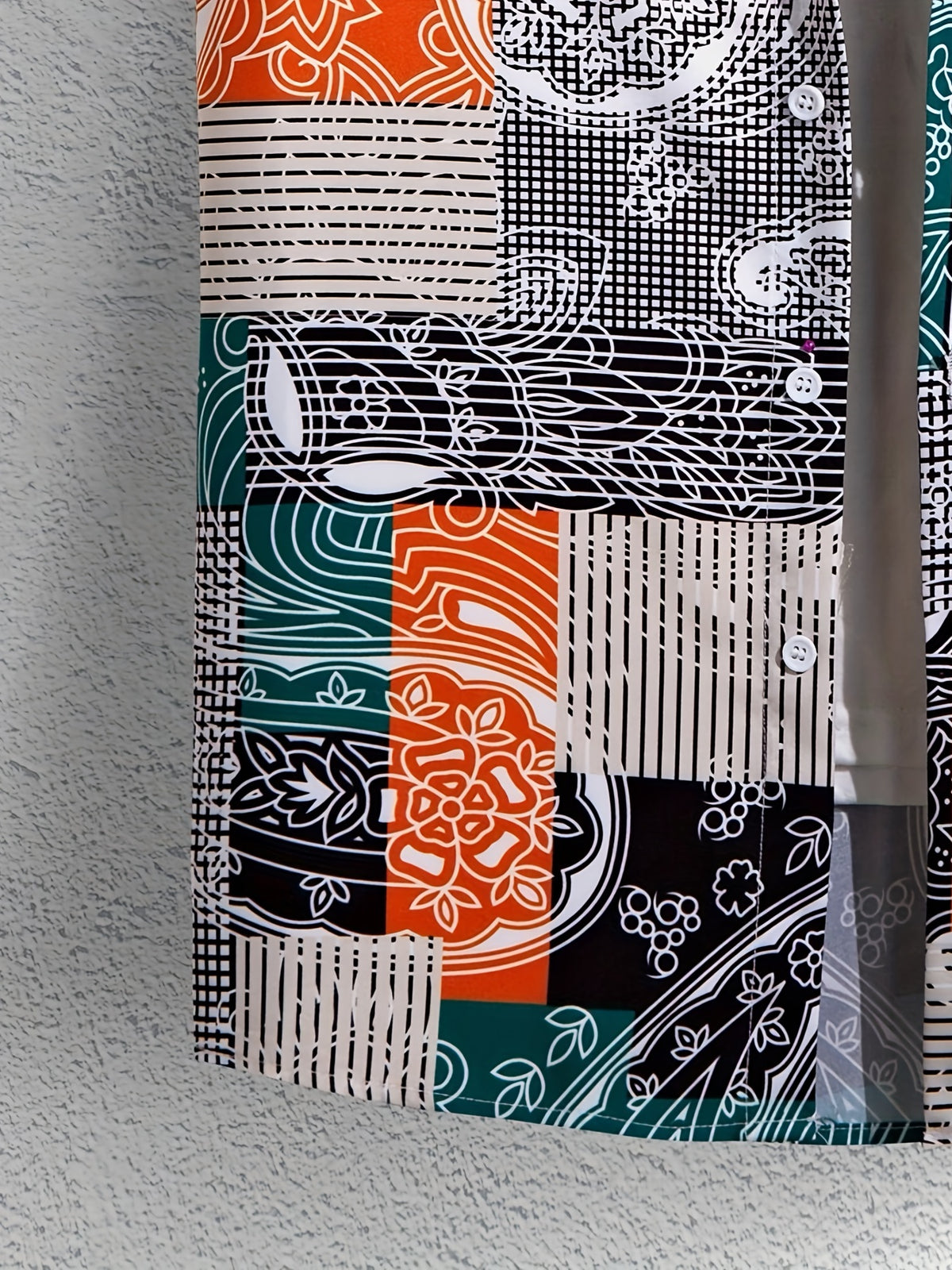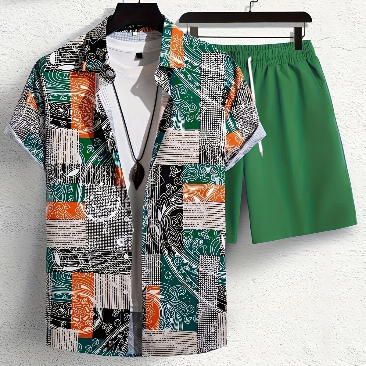 Plus Size Mens Summer Outfit - Stylish 2-Piece Ensemble with Unique Patchwork Print Graphic Short-Sleeve Shirt and Matching Shorts - Perfect for Hot Summer Days