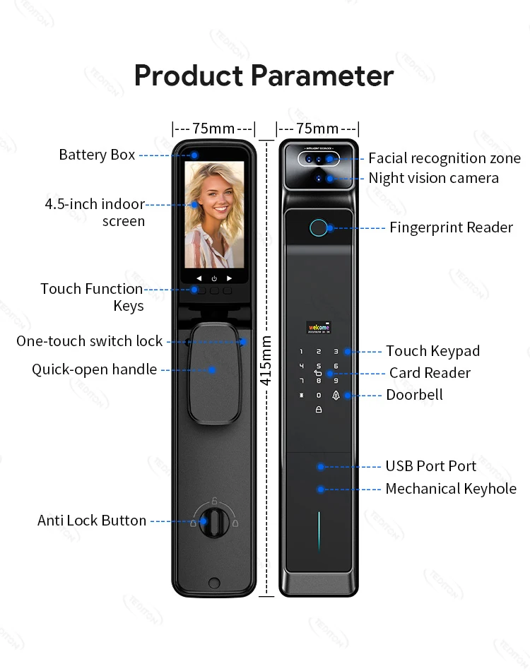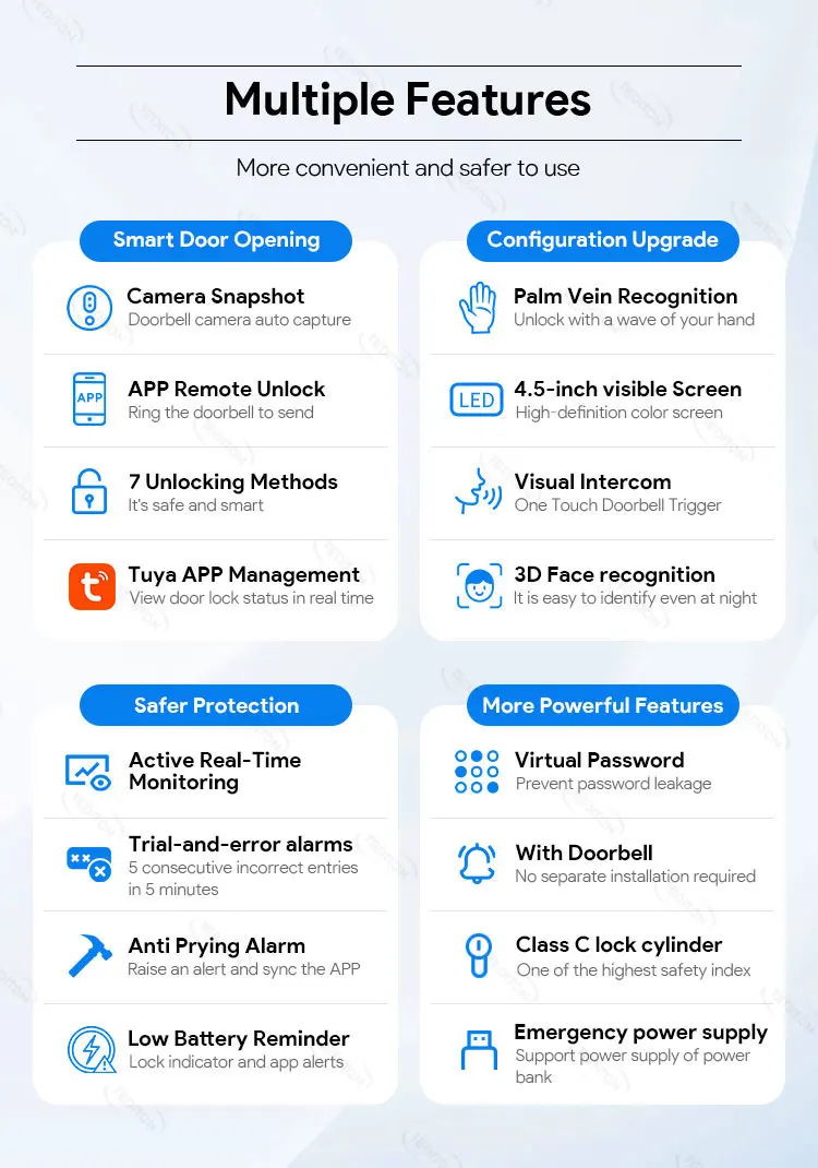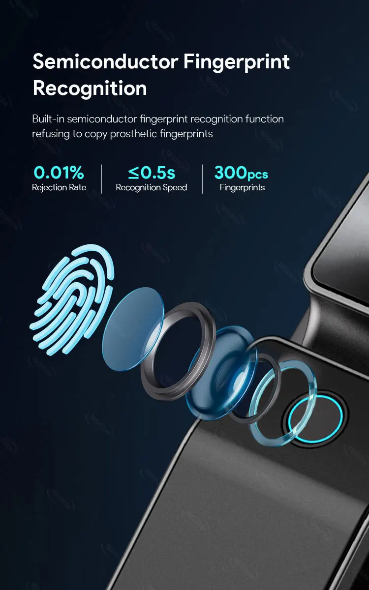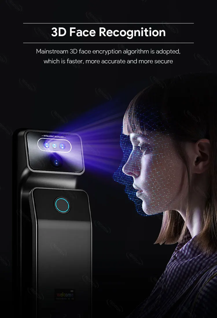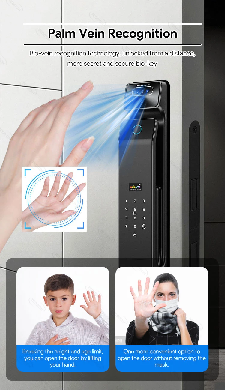 1. 7 ways to unlock: 3D Face, APP, Fingerprint Unlock, Palm Veins,Pass Code, Card, Mechanical Key Unlock;
