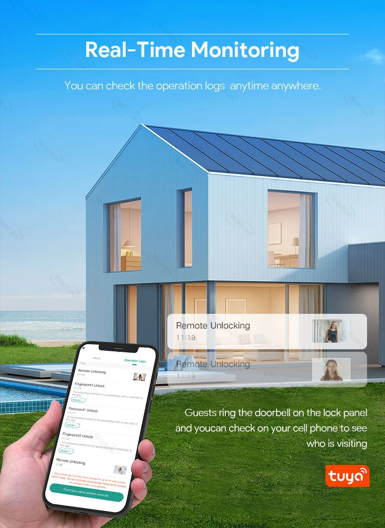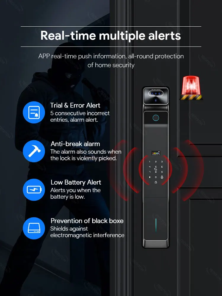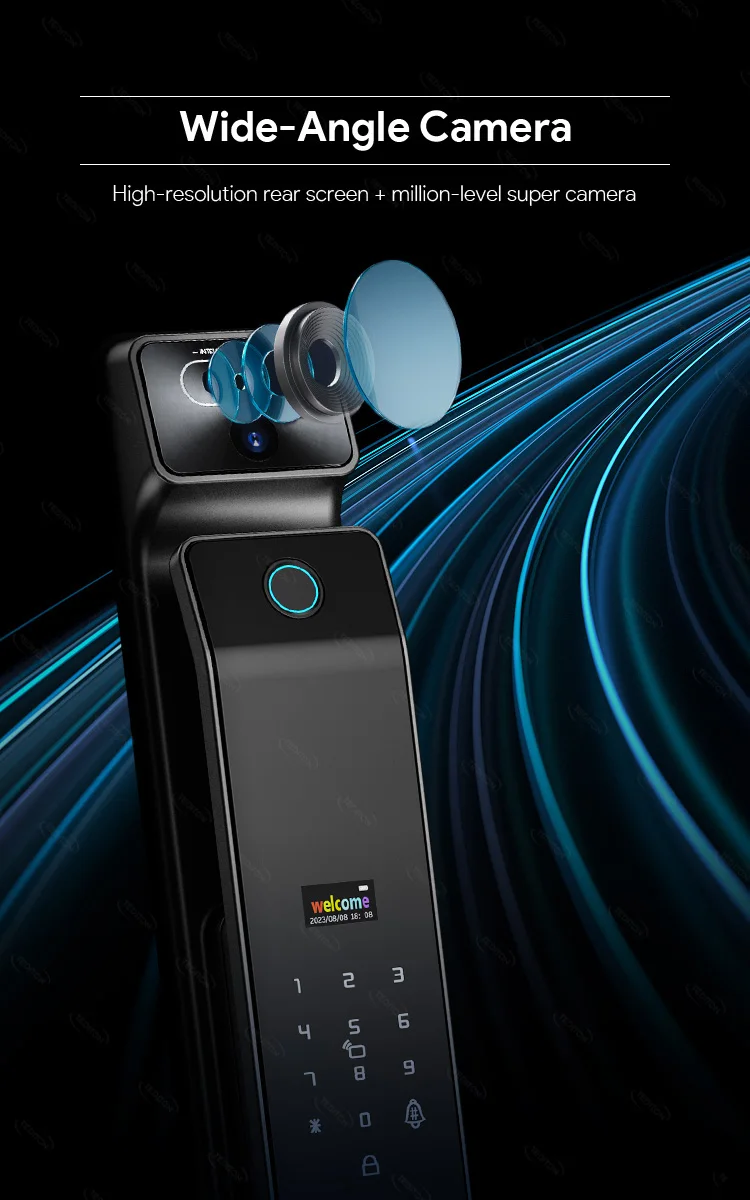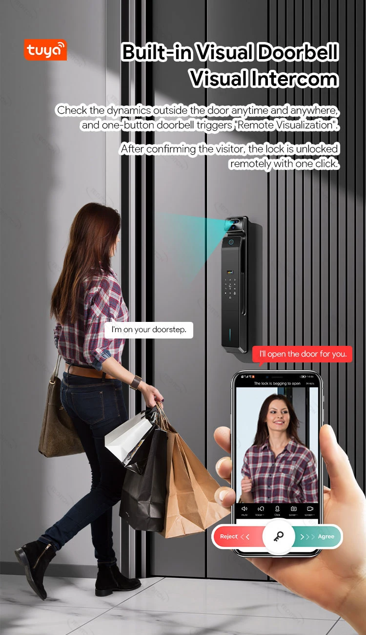 2. Visual real time intercom with Peep hole: you can see who is in front of your door remotely by phone or at home by screen on lock.