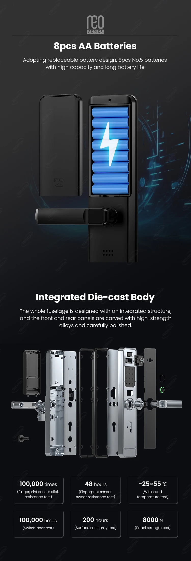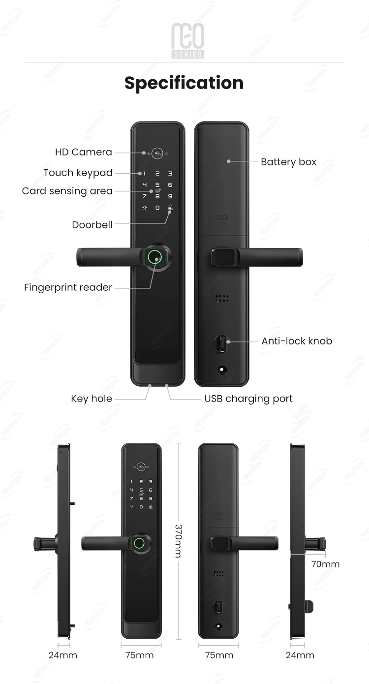 Technical Specification Material: Aluminum Alloy Lock panel Unlock mothod: App, face, fingerprint, password, card, manual key. Battery:8 pcs AA batteries