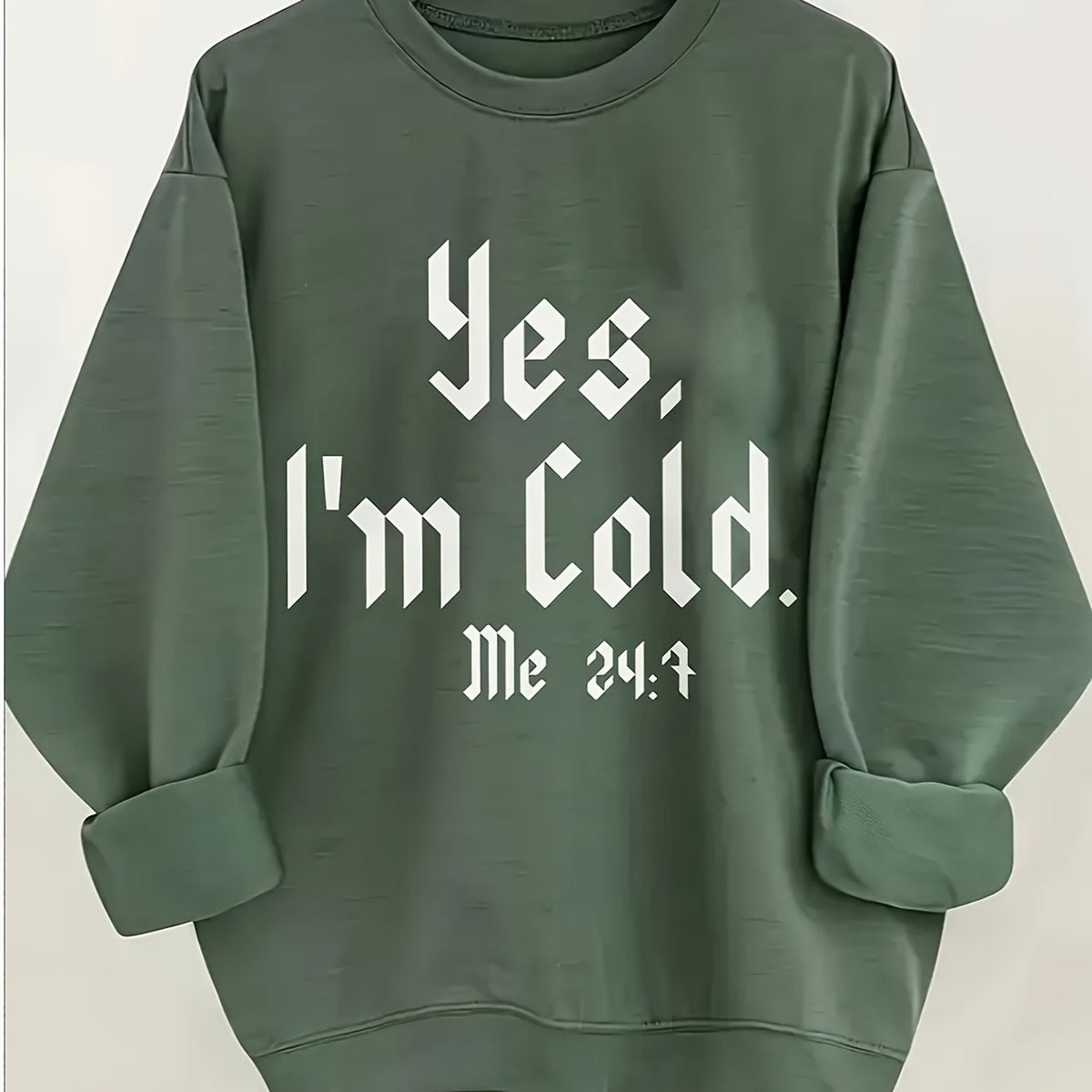 Women's Funny "Yes, I'm Cold" Sweater - Olive Green Crewneck Pullover, Loose Fit Casual Sweater for Everyday Winter Outfits - Machine Washable Cold Weather Clothing, Cozy Clothing, Playful Design, Comfortable Material, Long S